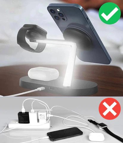 Meie laadimisjaam läheb tavalisest kaugemale, sisaldades kaitsefunktsioone, nagu võõrkeha tuvastamine, temperatuurikontroll, ülevoolukaitse ja ülepingekaitse. Tänu täiendavale USB-pordile neljanda seadme, näiteks iPadi jaoks saate laadida vertikaalselt või horisontaalselt, et videote või filmide vaatamise ajal oleks optimaalne nurk.