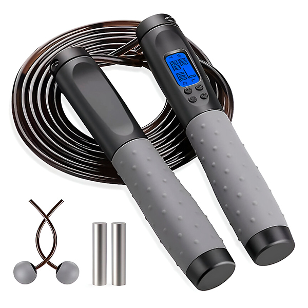 Ekraan näitab: kaloreid (kuni 999), hüppeid (kuni 9999), kaalu (20–120 kg), aega (1–60 minutit)