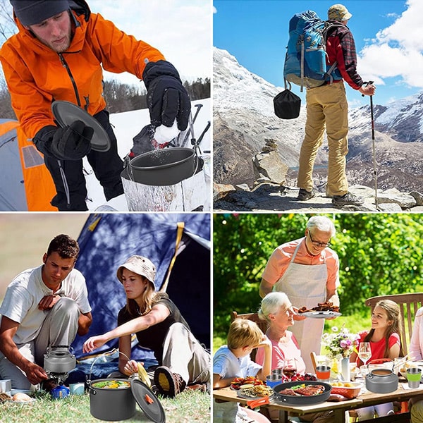Valmistage toitu kõikjal selle mitmekülgse, kompaktse ja kerge kööginõude komplektiga, mis sobib ideaalselt koju, reisile ja õues seiklusteks.